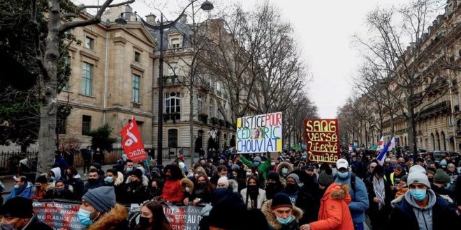 Paris’te, geçen sene polis tarafından boğazına bastırılarak gözaltına alınan ve iki gün sonra yaşamını yitiren 42 yaşındaki motorlu kurye Cedric Chouviat için adalet talebiyle eylem gerçekleştirildi.
