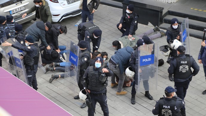 6 Ocak’ta gerçekleşen polis baskınlarında 18’i eyleme katıldığı, 3’ü sosyal medya paylaşımları gerekçesiyle gözaltına alınan 21 kişi bugün Çağlayan’daki İstanbul Adliyesi’ne getirildi. Üniversite öğrencileri adliyeye getirilen arkadaşları için Çağlayan Meydanı’nda eylem gerçekleştirdi. 21 kişi savcılık ifadelerinin ardından adli kontrol talebiyle Sulh Ceza Hakimliği’ne sevk edildi. Hakimlik tarafından tümünün adli kontrol şartıyla serbest bırakılmasına karar verildi. Gözaltından çıkan öğrenciler, dışarıda bekleyen arkadaşlarıyla birlikte Çağlayan Meydanı’nda basın açıklaması gerçekleştirdi.