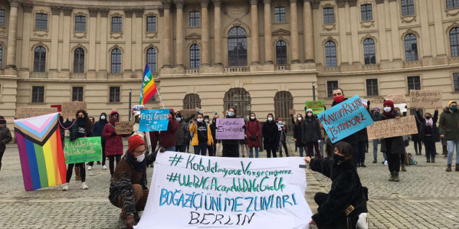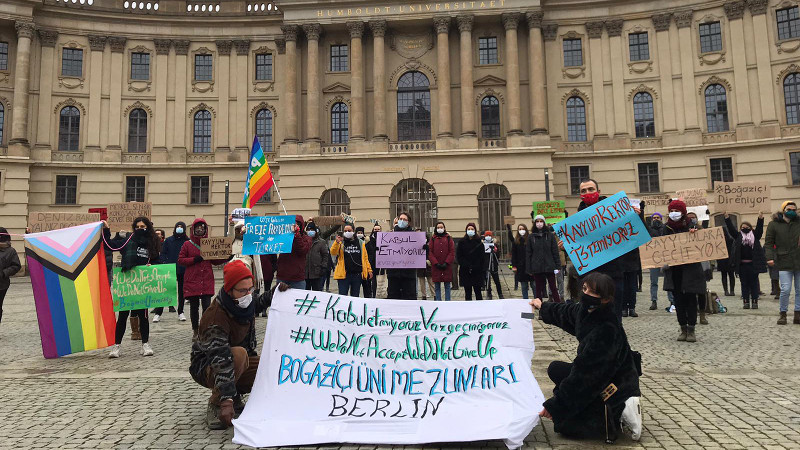 Almanya’da Boğaziçi Üniversitesi mezunları, öğrencileri ve öğretim görevlilerini eylemlere destek vermek için Berlin’de bulunan Humboldt Üniversitesi önünde bir araya geldi. “Kabul etmiyoruz, vazgeçmiyoruz” yazılı pankart açan grup “Kayyum rektör istemiyoruz”, “İntihalsiz, torpilsiz”, “Akademi biat etmez”, “Boğaziçi direniyor”, “Kayyuma geçit yok” yazılı dövizler taşıdı.