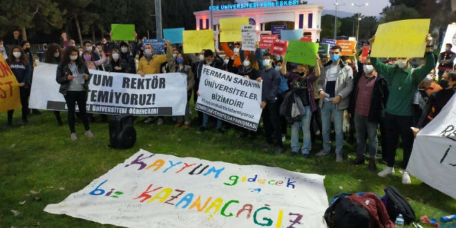 İzmir’de de Ege Üniversitesi öğrencileri rektör atamalarına karşı eylem gerçekleştirdi. Çeşitli etkinliklerle rektör atamalarını protesto eden öğrenciler rektör Nejdet Budak’ın kapısına “Bu bina AKP’li Necdet Budak’ın rektör atanması sebebiyle Ege Üniversitesi öğrencileri tarafından mühürlenmiştir.” yazılı mühür astı.