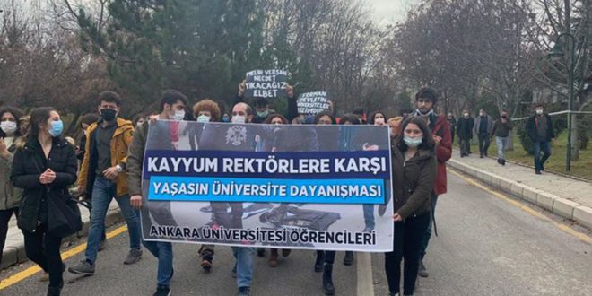 Kampüs dışında açıklama yapmaları polis tarafından engellenen Ankara Üniversitesi öğrencileri kampüs içinde eylem gerçekleştirdi. “Kayyum rektörlere karşı yaşasın üniversite dayanışması” pankartı açan öğrenciler kampüse “Ferman devletin, üniversiteler bizim” sloganıyla girdi. Tandoğan Kampüsü içinde yürüyüş gerçekleştiren öğrenciler “Bu daha başlangıç, mücadeleye devam!” “Ferman devletin, üniversiteler bizimdir!” sloganları attı. Öğrenciler yürüyüşün ardından rektörlük önünde basın açıklaması gerçekleştirdi.