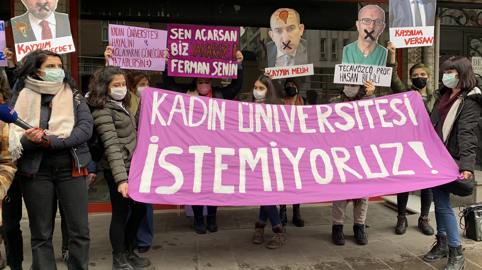 “Kadın üniversitesi istemiyoruz” yazılı pankart açan üniversiteli kadınlar, “Kadın üniversitesi hayalini ağlayarak günlüğüne yazabilirsin”, “Sen açarsan biz yakarız! Ferman senin” dövizleri taşındı.