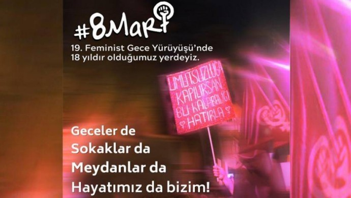 “19’uncu 8 Mart Feminist Gece Yürüyüşü’nde 18 yıldır olduğumuz yerdeyiz. Geçen sene Taksim’de onbinler olarak bir araya gelip Karaköy’e yürüdüğümüz, sokak sokak meydan meydan sesimizi yükselttiğimiz, birbirimize temas ederek birbirimizden güç aldığımız günden bu yana hem çok şey değişti hem pek bir şey değişmedi. Patriyarkanın, baskının, bıkkınlığın, krizlerin binbir biçimi üzerine bir de pandemi eklenirken bizler bu zor günlerde umutsuzluğa kapılmamak için feminist mücadelemizden güç aldık. Birlikte coşkuyla, öfkeyle en çok da dayanışmayla yan yana durduğumuz anları hatırladık, dayanışmamızın gücünü hatırladık.