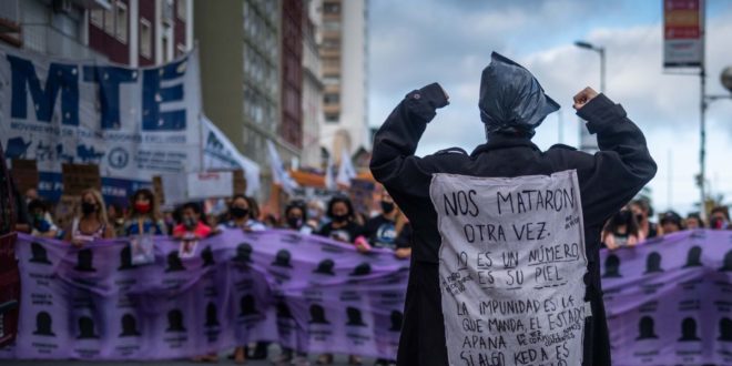 Buenos Aires’teki adliye binası önünde gerçekleşen eyleme binlerce kadın katıldı. Bir grup kadın kadın cinayetlerinin kurbanlarını temsil etmek için adliye binası önünde çıplak ve şeffaf plastikle örtülü bir şekilde yatarak, “1 Ocak – 30 Aralık 2020’de 298 kadın cinayeti 54’ü önceden şikayette bulundu, 19’u adli tedbir aldı ve 15 kadın cinayeti silahlı veya güvenlik güçlerine ait. Patriyarkal adalet yeter, Devlet sorumludur. ” yazılı pankart açtı.