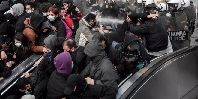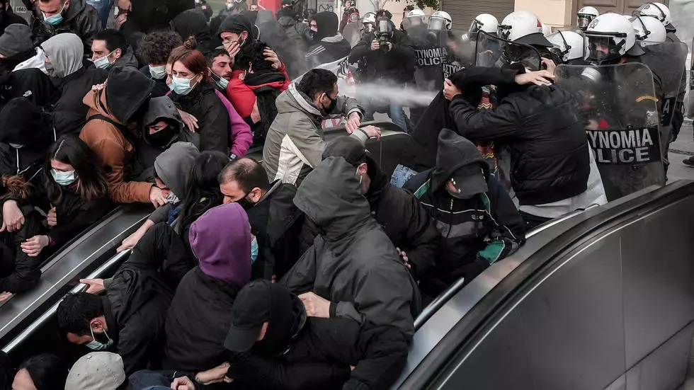 Omonia Meydanı’nda yapılmak istenen eyleme yönelik polis saldırısının ardından çatışma yaşanırken polis metro istasyonu girişine biber gazı attı.