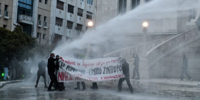 Ablukaya rağmen bir araya gelen eylemcilere polis tazyikli su ve biber gazı ile saldırdı. Saldırılarda aralarında Dimitris Koufodinas’ın oğlu Hector Koufodinas’ın da olduğu onlarca kişi darp edilerek gözaltına alındı. Polis, çevredekilere ve eylemi takip eden gazetecilere de saldırdı.