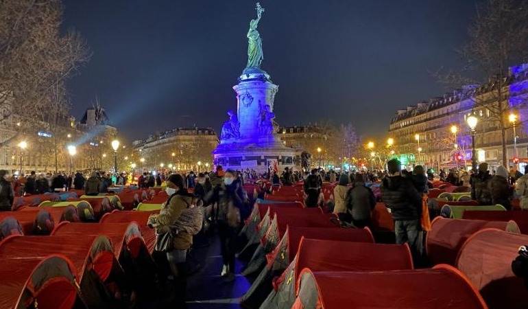 Fransa’nın başkenti Paris’te yüzlerce göçmen ve dayanışmacının katılımıyla République Meydanı’nda kağıtsız göçmenlere barınma hakkı sağlanması ve koşullarının düzeltilmesi için çadır kamp kuruldu.