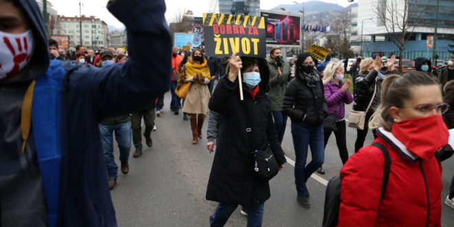 Bosna Hersek’in başkenti Saraybosna’da Salı günü, Covid-19 pandemisi sürecindeki başarısız politikaları nedeniyle hükümetin istifası talebiyle eylem düzenlendi. Yaklaşık 1000 kişinin katıldığı eyleme sürücüler de korna çalarak destek verdi. “Hayatımızla oynama” “Aşı istiyoruz” ve “İstifa” yazılı dövizler taşıyan eylemciler başkentin önemli caddelerinden birini trafiğe kapatarak yürüyüş gerçekleştirdi.