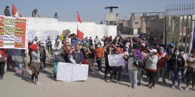 Peru’nun başkenti Lima’nın Villa Maria del Triunfo semtinde bulunan Lomo de Corvina’da, Çarşamba günü, yaklaşık 7000 ailenin bulunduğu derme çatma barınaklarda yaşayanlar, kendilerine insanca barınma imkanı sağlanmadan, yaşadıkları kampın boşaltılmak istenmesine karşı eylem gerçekleştirdi.