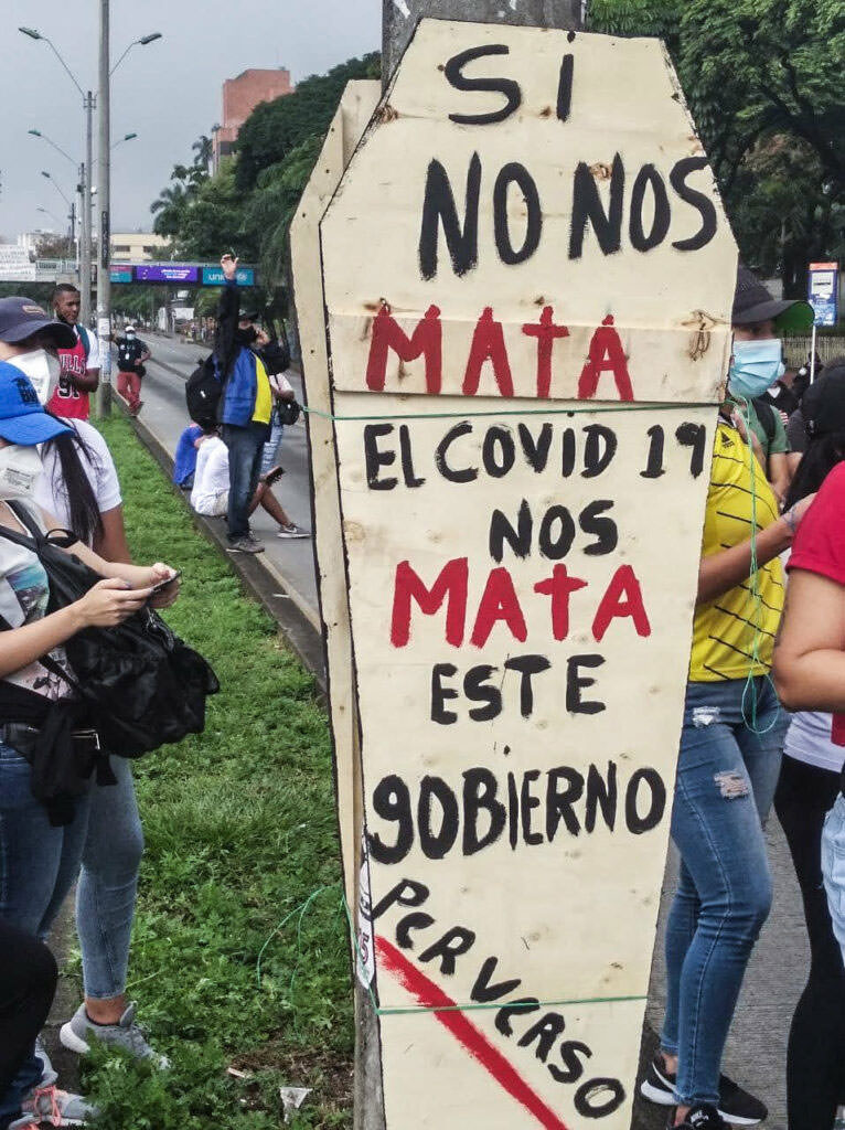 Duque yönetiminin, COVID-19’un neden olduğu krizi yozlaşmış ve umursamazca yönetmesi, ülkeyi katlanarak artan yoksulluğun kucağına attı. Hükümetin verilerine göre 2020 yılında hastane altyapısına ve insani yardıma ekonomik transferler yoluyla, 11,5 milyon ABD doları tutarında yatırım yapıldı. Ancak bu politikaların yürütülmesi süreci ile ilgili binlerce yolsuzluk iddiası var. Bu arada Duque hükümeti, en çok ihtiyaç duyan haneleri ayakta tutmanın bir yolu olarak, aralarında en az 50 milletvekilinin de bulunduğu 4000 kişinin imzaladığı bir temel gelir teklifini hayata geçirmekte başarısız oldu. Gün geçtikçe, bu insanlar hayatta kalmak için sokağa çıkmak ve virüse maruz kalma riskini almak zorunda kaldılar.