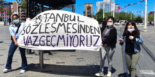 Taksim Meydanı’nda bir araya gelerek “İstanbul Sözleşmesi’nden vazgeçmiyoruz” pankartı açan kadınlar “Susmuyoruz, korkmuyoruz, itaat etmiyoruz” sloganı attı.