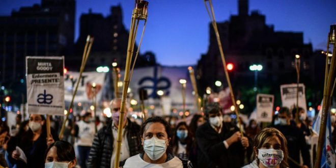 Arjantin’nin birçok noktasında dün binlerce sağlık çalışanı, Uluslararası Hemşireler Günü sebebiyle sokağa çıktı. Hemşirelerin yanı sıra doktorlar, teknisyenler ve sağlık asistanlarının da katıldığı eylemlerde özellikle pandeminin ortasında daha iyi ücretler ve koşullarının düzeltilmesini talep edildi.