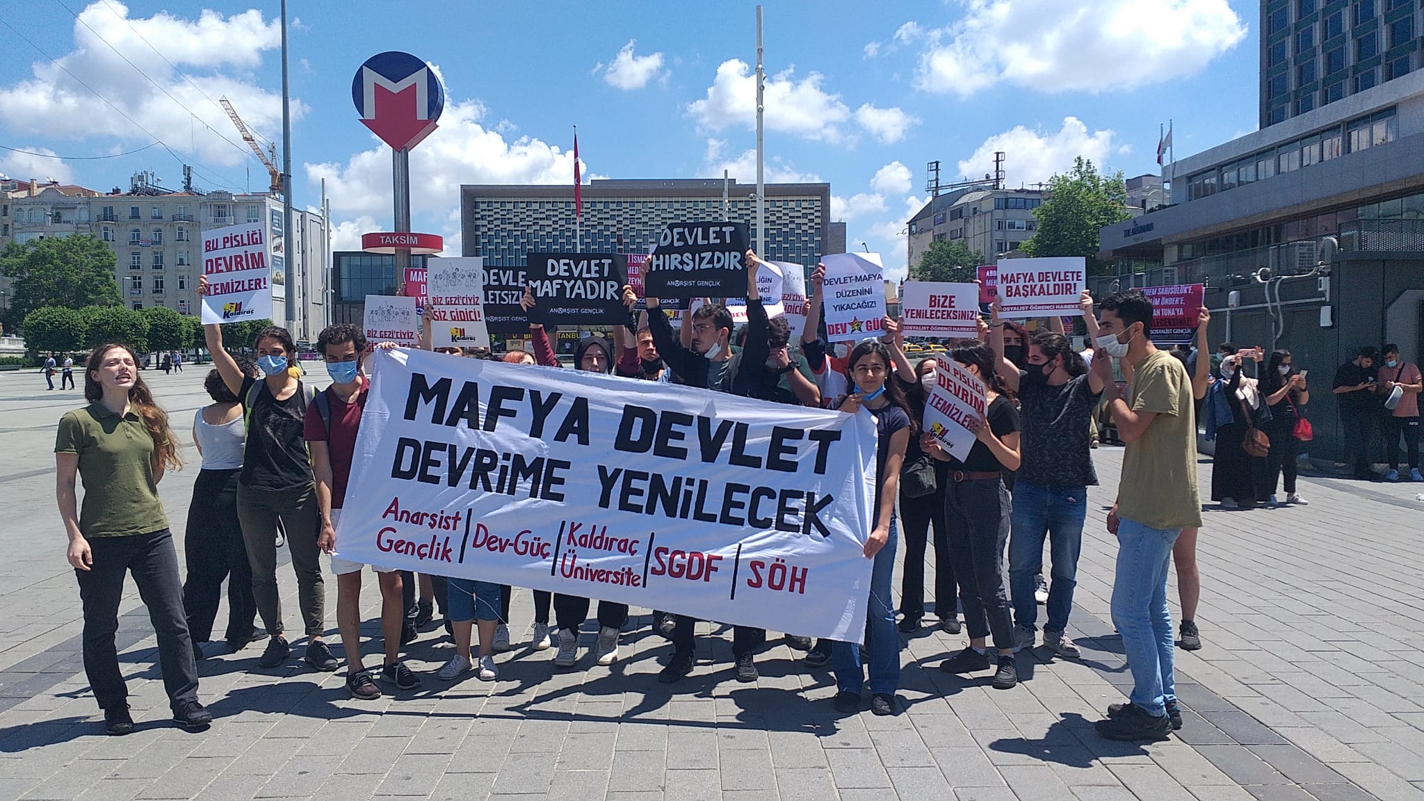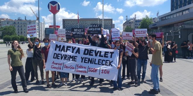 Anarşist Gençlik, Dev-Güç, Kaldıraç Üniversite, SGDF ve SÖH’ün çağrısıyla Taksim Meydanı’nda eylem gerçekleştirildi. “Mafya devlet devrime yenilecek” pankartı açan gruba polis saldırdı.