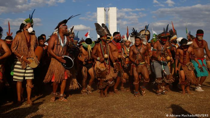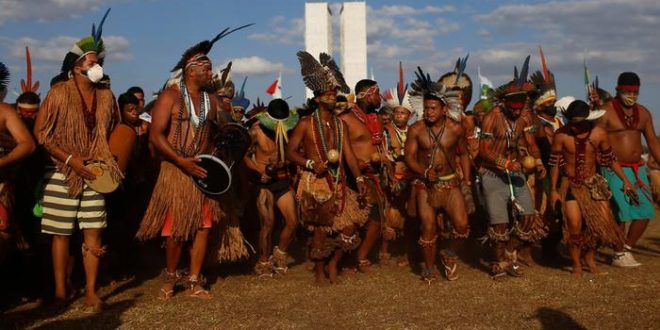 Brezilya’nın başkenti Brasilia’da yerlilerin toprakları için korumaları tümüyle kaldırması ve toprakların büyük şirketlerin kullanımına açılarak talan edilmesinin önünü açması beklenen bir yerel mahkeme kararının Brezilya Federal Yüksek Mahkemesi’nde görüşülmesi sırasında eylem düzenlendi.