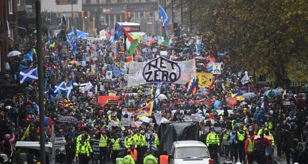 Konferansa karşı Glasgow’un batı ucundaki Kelvingrove Park’ta başlayan ve doğuda Glasgow Green’de biten yürüyüşe 100.000’den fazla kişi katıldı. Eylemde aralarında çevre örgütleri, sendikalar, iklim aktivistleri ve politik örgütlerin olduğu farklı çevreler yer aldı.