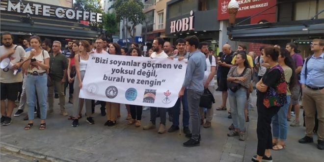 İzmir Alsancak Türkan Saylan Kültür Merkezi önünde gerçekleşen eylemde, “Bizi soyanlar göçmen ve yoksul değil, buralı ve zengin” pankartı açıldı ve sık sık “Kurtuluş yok tek başına ya hep beraber ya hiçbirimiz”, “Yaşasın hakların kardeşliği” sloganları atıldı.