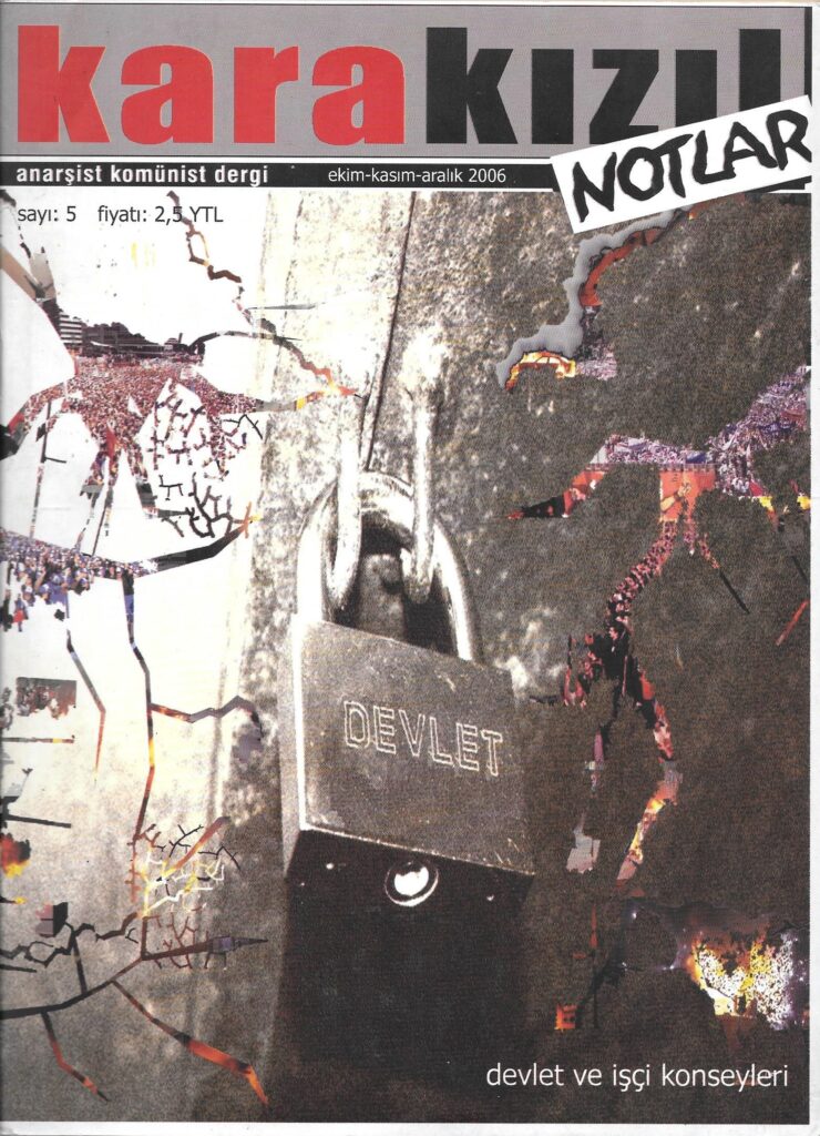 2005-2006 yılları arasında 7 sayı yayımlanan anarşist komünist dergi Kara Kızıl Notlar’ın “Devlet ve İşçi Konseyleri” başlıklı 7. Sayısını (Resmi 5. Sayı) paylaşıyoruz.