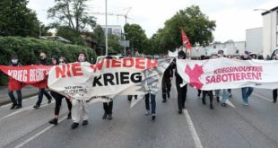 kategori: HaberlerAlmanya’nın önemli silah şirketlerinden biri olan Krauss-Maffei Wegmann’ın (KMW) yer aldığı Kassel kenti, savaş karşıtlarının iki önemli eylemine ev sahipliği yaptı. Krauss-Maffei Wegmann (KMW) şirketi önünde blokajla, kent merkezinde de yürüyüşle silah üretimi ve ihracatı protesto edildi. Almanya’nın tank benzeri ağır silahlar üreten silah fabrikalarından biri olan Rheinmetall’e karşı oluşturulan “Rheinmetall’i silahsızlandırma” itifakının gerçekleştirdiği eyleme…