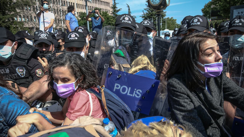 kategori: HaberlerAnkara Kadın Platformu’nun 12 Ağustos 2020’de gerçekleştirdiği İstanbul Sözleşmesi eylemi nedeniyle, 33 kadın hakkında açılan davanın ilk duruşması Ankara 28. Asliye Ceza Mahkemesinde görüldü. Duruşma öncesi Ankara Adliyesi önünde basın açıklaması yapmak için toplanan kadınlara polis biber gazı ve kalkanlarla saldırdı. Polis saldırısına tepki gösteren kadınlar, “Susmuyoruz, korkmuyoruz, itaat etmiyoruz”, “Erkek adalet değil gerçek adalet”,…