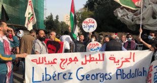 kategori: Haberler1984 yılından beri Fransa hapishanelerinde tutsak olan Lübnan Silahlı-Devrimci Fraksiyonları (LARF) lideri Georges Abdallah’ın 70. yaş gününde Fransa’nın Beyrut Büyükelçiliği önünde eylem gerçekleştirildi. Çarşamba günü gerçekleştirilen eylemde ‘Avrupa’nın en yaşlı siyasi mahkumu’ olarak anılan Abdallah’ın derhal serbest bırakılması talep edildi. Eylemde “Özgür Georges Abdullah”, “36 yıl zorunlu gözaltı” yazılı dövizler taşındı. Georges Abdallah, Ekim 1984’te…