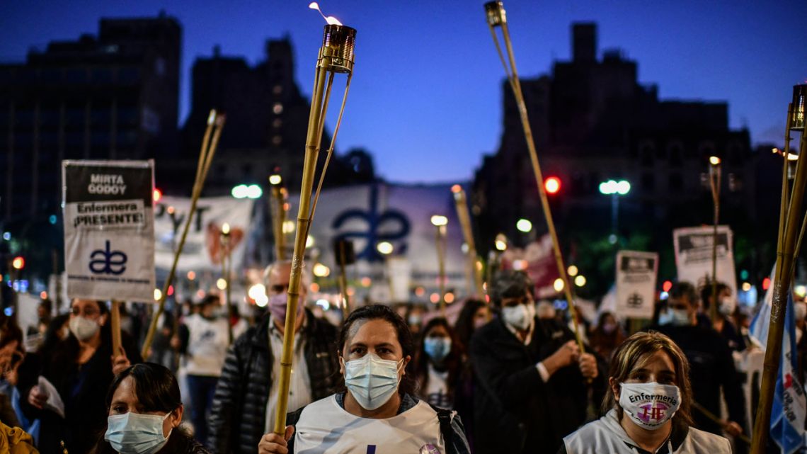 kategori: HaberlerArjantin’nin birçok noktasında dün binlerce sağlık çalışanı, Uluslararası Hemşireler Günü sebebiyle sokağa çıktı. Hemşirelerin yanı sıra doktorlar, teknisyenler ve sağlık asistanlarının da katıldığı eylemlerde özellikle pandeminin ortasında daha iyi ücretler ve koşullarının düzeltilmesini talep edildi. Başkent Buenos Aires’te eylemciler, Ulusal Kongre’den Plaza de Mayo’ya yürüyüş gerçekleştirdi. Covid-19 salgınında 68.000’den fazla kişinin öldüğü Arjantin’de geçtiğimiz ay…