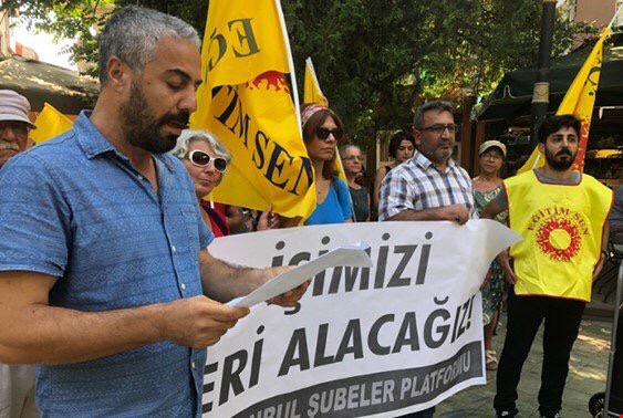 kategori: HaberlerKanun Hükmünde Kararname (KHK) ile işten çıkartılan kamu emekçilerinin işlerine geri dönme talebiyle Kadıköy Altıyol Meydanı’nda gerçekleştirdikleri eyleme polis saldırdı. Dağılın anonsuna “İşimizi geri alacağız” sloganıyla karşılık veren eylemcilere saldıran polis üç kişiyi gözaltına aldı. Gözaltına alınan Sema Uçar, Mehmet Sarı ve Ali Haydar Arıkuşu’nun Vatan Caddesi’ndeki İstanbul Emniyet Müdürlüğü’ne götürüldüğü öğrenildi. Kamu emekçilerinin 2 ve 4…