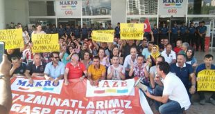 kategori: HaberlerSamsun’da işten çıkarılan Makro Market işçileri tazminat hakları için, Petrol Ofisi önünden otogar Makro AVM’ye kadar yürüyüş yaptı. Makro AVM önünde basın açıklaması yapan işçiler haklarını alana kadar eylemlerini sürdürme kararlılıklarını belirtip oturma eylemi gerçekleştirdi. İşçiler adına açıklamayı Samsun Tez-Koop-İş Başkanı Tarık Sayın yaptı. Sayın açıklamasında işçilerin haklarını alıncaya kadar Makro mağazaları önlerinde ve alanlarda eylemlerin…
