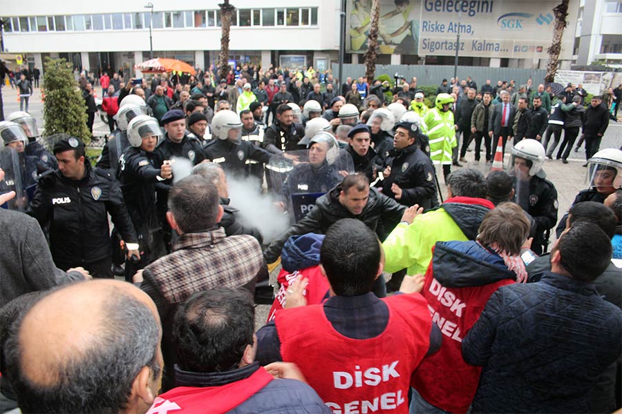 kategori: HaberlerDİSK Genel-İş üyelerinin toplu sözleşme ile ilgili büyükşehir belediye başkanlığı girişinde yapmak istediği eyleme polis saldırdı. Saldırı sırasında en az 15 işçi gözaltına alındı. Genel-İş, İzmir genelinde otobüsler dahil iş bırakma kararı aldı. İzmir Büyükşehir Belediyesi’nin İZENERJİ’de örgütlü Genel-İş İzmir 2 No’lu Şubesinin yetkisine yaptığı itiraz bugün sendika tarafından yapılacak eylemle protesto edilecekti. Sabah saatlerinde…