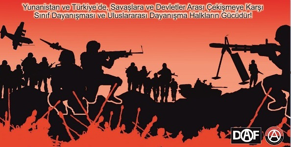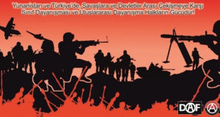 kategori: MakalelerDoğu Akdeniz’de giderek artan gerilime karşı Türkiye’den Devrimci Anarşist Faaaliyet (DAF) ve Yunanistan’dan Anarşist Politik Örgütlenme ortak bir bildiri yayınladı. Yunanistan ve Türkiye’de, Savaşlara ve Devletler Arası Çekişmeye Karşı Sınıf Dayanışması ve Uluslararası Dayanışma Halkların Gücüdür! Ekonomik ve politik iktidarlar her yeri, canlı-cansız tüm varlıkları, bütün toplulukları kontrol etmeyi ve sömürmeyi amaçlayan savaşlarla, askeri operasyonlarla,…