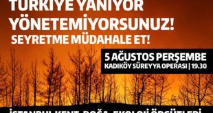 kategori: Haberlerİstanbul’da kent, doğa ve ekoloji örgütleri iklim krizinin sonucu olan ve iktidarın ihmalleri ile daha da büyüyen orman yangınlarına aktif müdahale edilmesini sağlamak amacıyla eylem gerçekleştirecek. Yaşam savunucuları yangınlara acil aktif müdahale edilmesini sağlamak ve bir daha yaşanmaması için bu iktidardan kurtulmak için harekete geçmeye çağırıyoruz ifadeleriyle bugün saat 19.30’da Kadıköy Süreyya Operası önüne eylem…