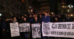 kategori: HaberlerKHK ile işten atılan ve işe geri dönme talebiyle 180 gündür açlık grevinde olan Nuriye Gülmen ve Semih Özakça ile dayanışmak için Ankara Yüksel Caddesinde gerçekleştirilen eyleme polis saldırdı. “Açlık grevinin 180. günü Nuriye ve Semih işe geri alınsın” yazılı pankartın açıldığı eylemde “Nuriye Semih yalnız değildir” sloganı atıldı. Yüksel caddesindeki direniş 300. gününü tamamlarken…