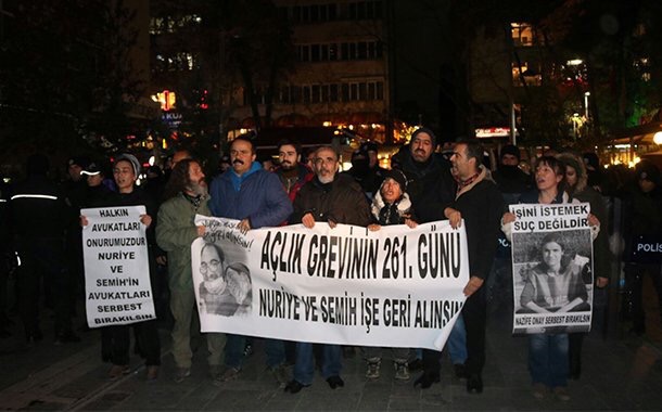 kategori: HaberlerYüksel Direnişi’nin 381’inci gününde “Nuriye ve Semih işe geri alınsın” talebiyle açıklama yapmak isteyen direnişçilere polis saldırdı. Saldırıda dokuz direnişçi gözaltına alındı. Kanun Hükmünde Kararname (KHK) ile işinden atılan Nuriye Gülmen’in başlatmış olduğu Yüksel Direnişi 381’inci, Nuriye Gülmen ve Semih Özakça’nın açlık grevi ise 261’inci gününü geride bıraktı. Yüksel Direnişi’nde bugün 18.00’da “Nuriye ve Semih…